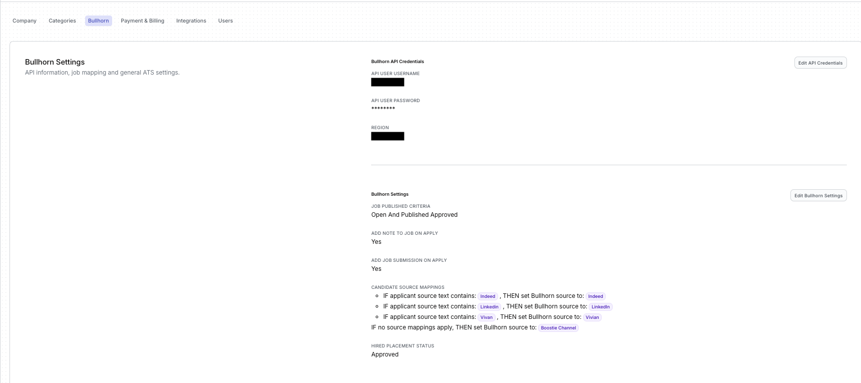The Bullhorn Settings section is where you connect Boostie to your ATS and define how jobs, applicants, and source values flow between the two systems. Once configured, this connection allows Boostie to sync jobs, track applicants, add notes, submit candidates, and power your analytics.