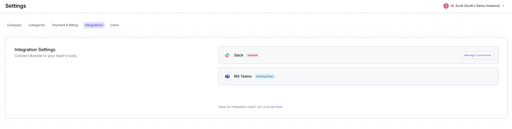 Go to Settings by clicking your name in the top right corner of the Boostie app. Then click Integrations in the navigation bar.