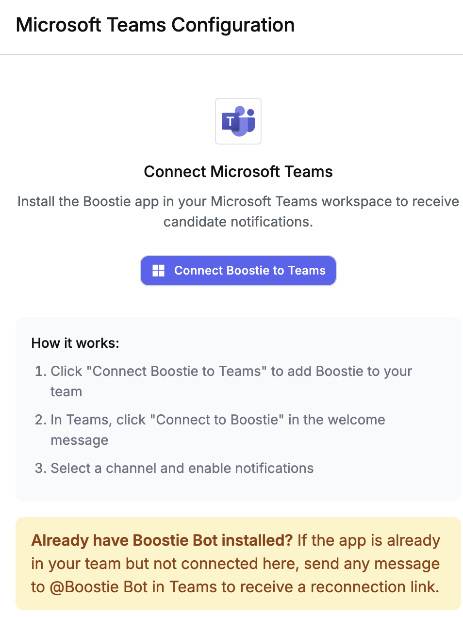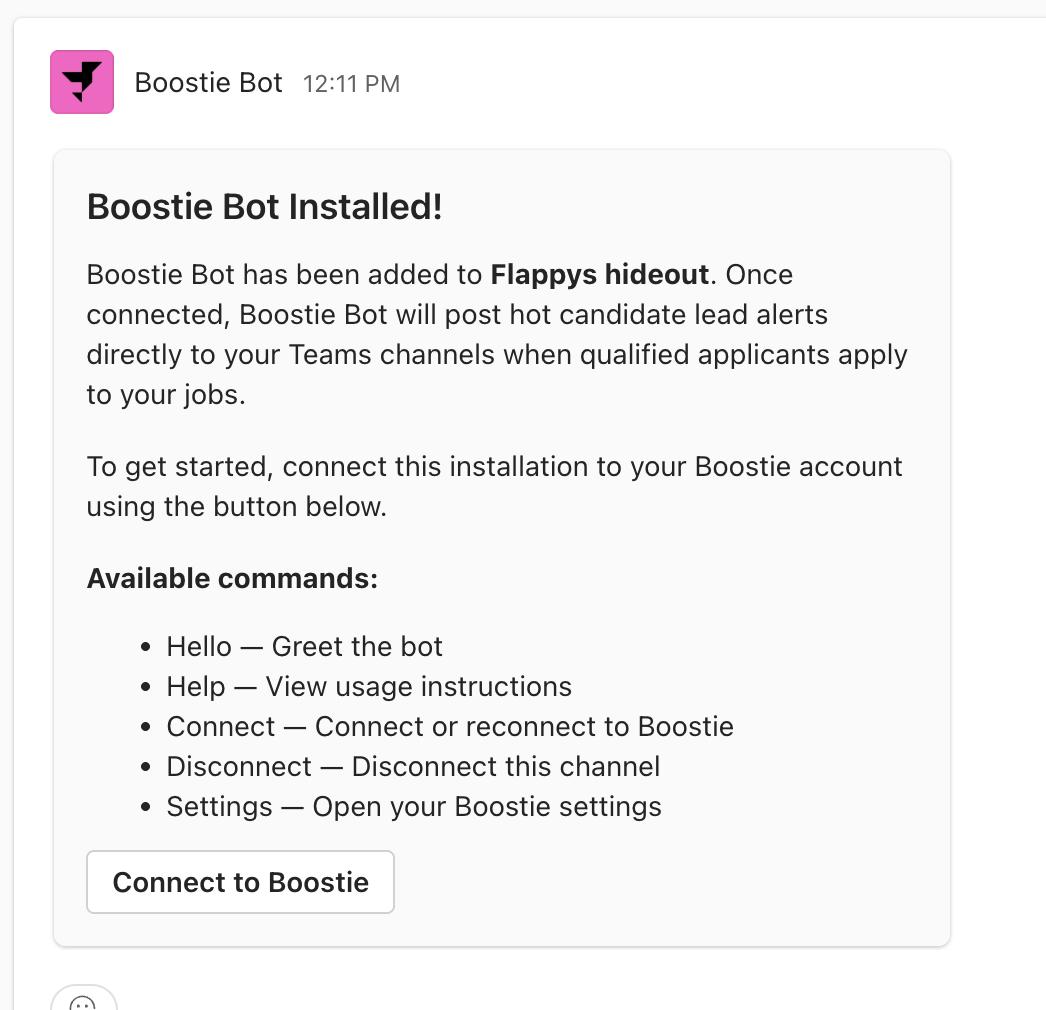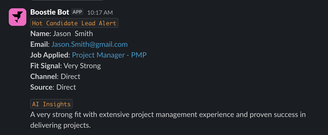 Boostie provides native Slack and Teams integrations that alert your team the moment a high-fit candidate applies. Notifications are delivered directly into the channel you choose and include: