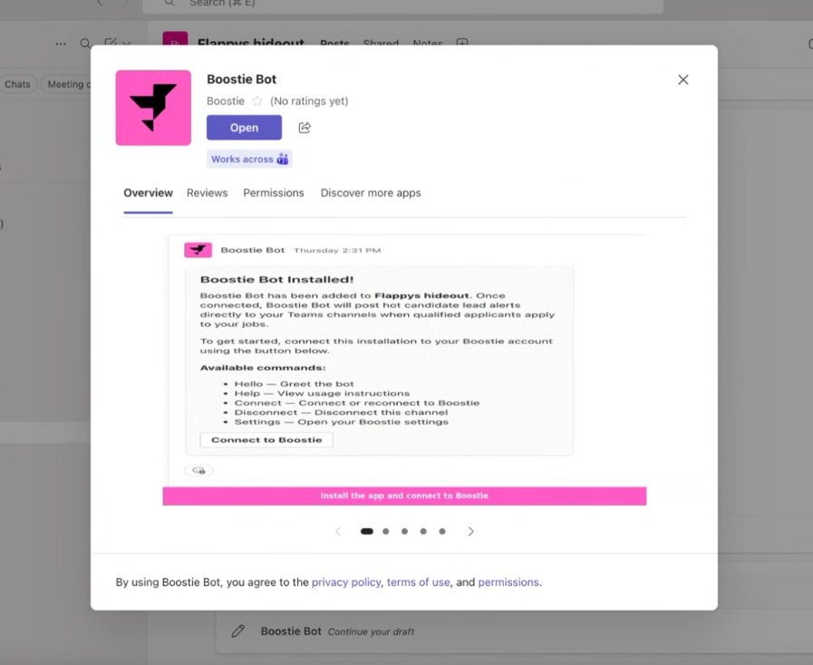 The Boostie Bot app listing will appear in Teams. Click Open.