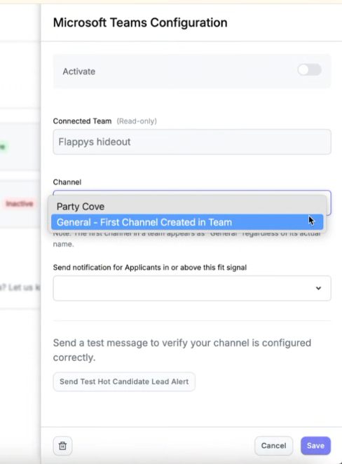 - Re-open the Manage Connection slide-out and click Send Test Hot Candidate Lead Alert. A green confirmation banner - "Test alert sent to Teams channel!" - will appear at the top of your screen.