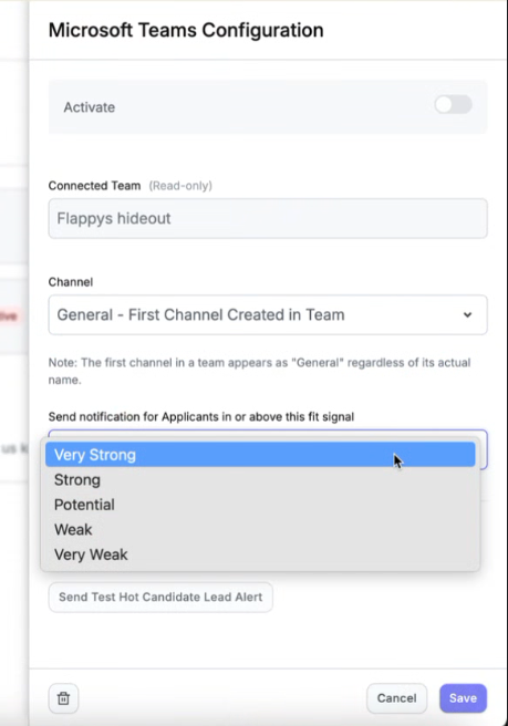 - Under Send notification for Applicants in or above this fit signal, choose the minimum fit signal that should trigger a Teams alert. Options include: Very Strong, Strong, Potential, Weak, and Very Weak.