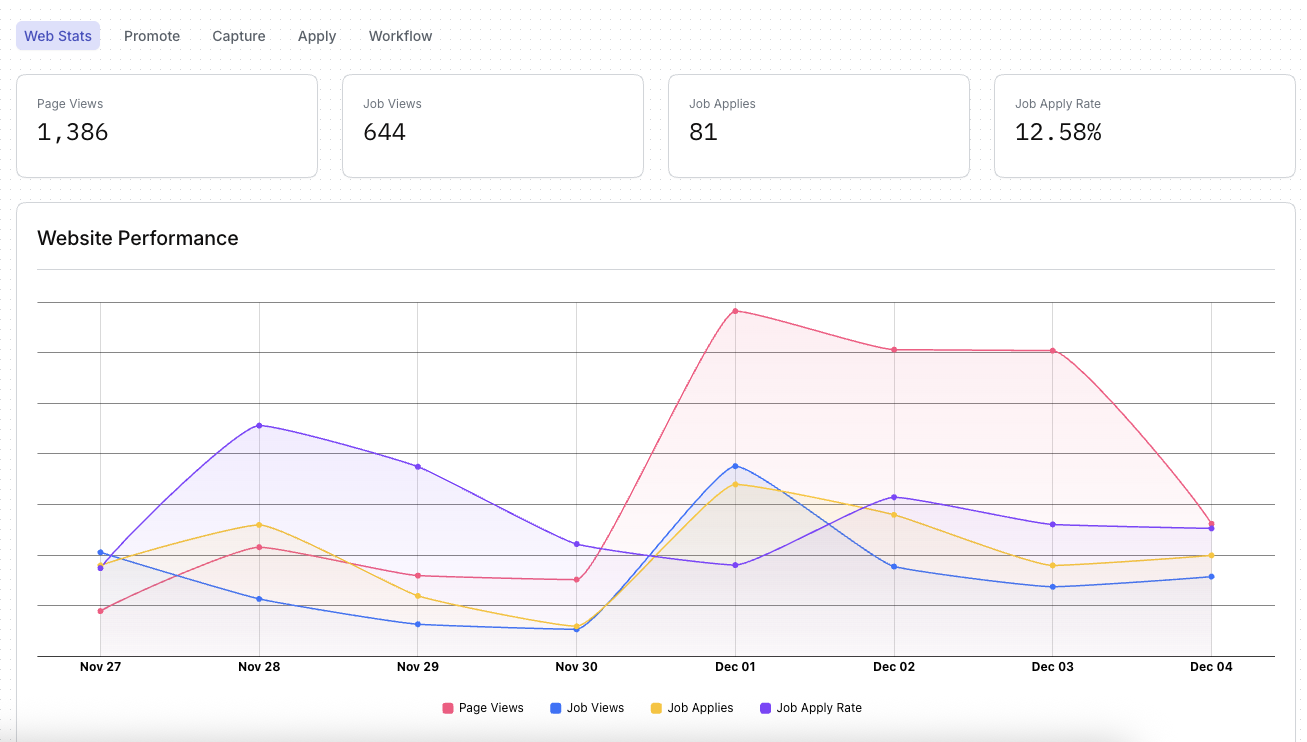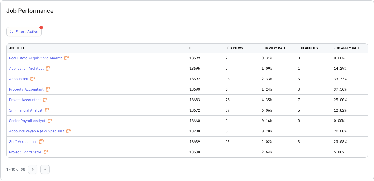 - Apply Page Views - How many people landed on your job’s application page - an indicator of job interest and traffic health.