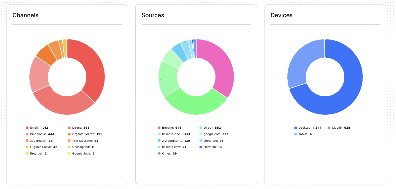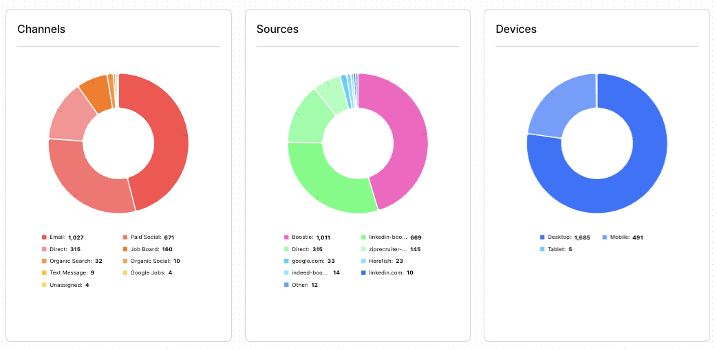 Boostie gives you a clear picture of where your candidate traffic is coming from and how people engage with your career site. These three attribution widgets - Channels, Sources, and Devices - help you understand what’s driving visibility, clicks, and apply behavior across your digital talent funnel.