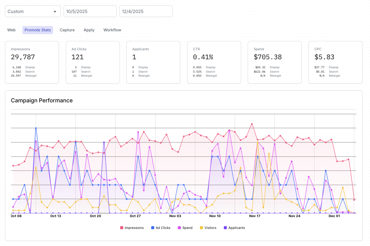 The performance chart visualizes how impressions, clicks, spend, visitors, and applicants trend over time. This helps you quickly identify: