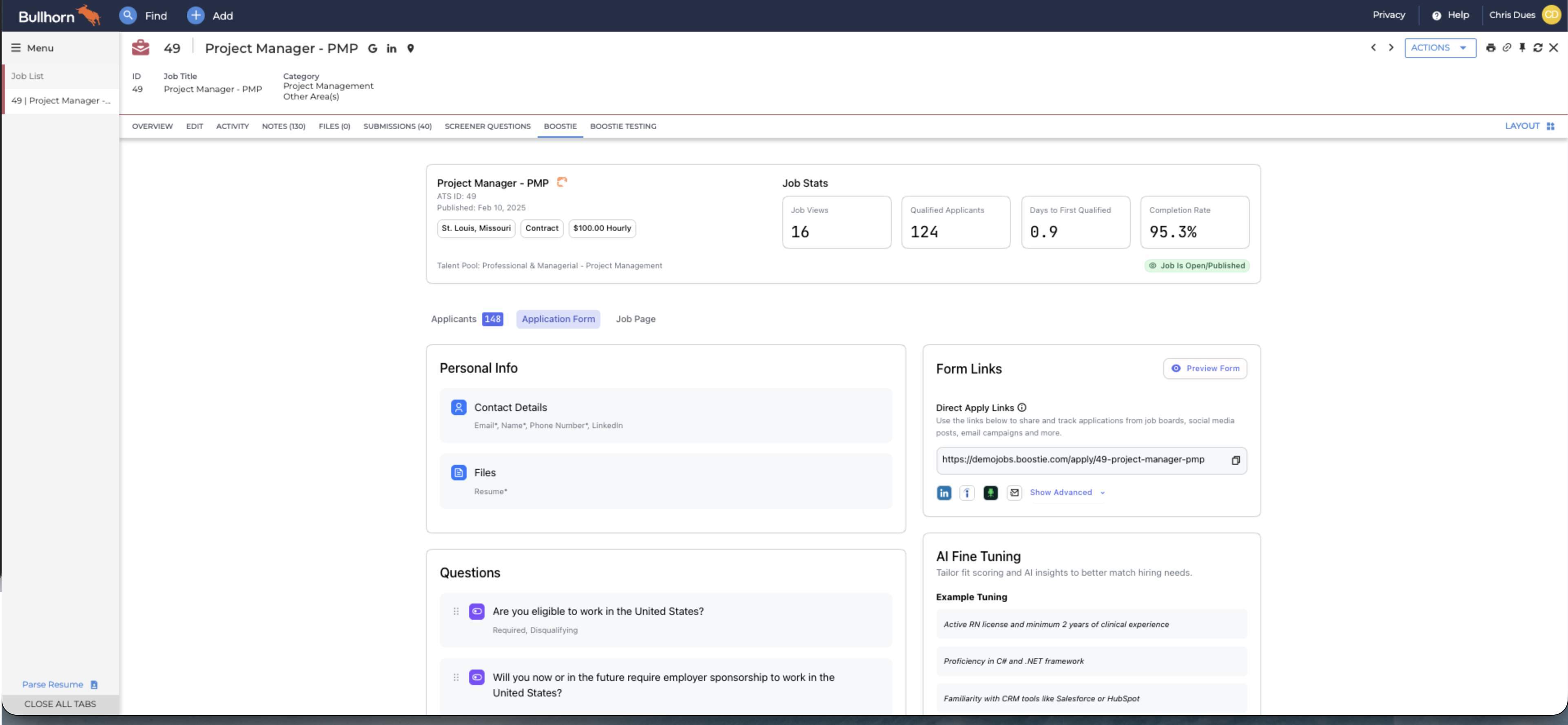 - Tune AI Fine Tuning after 10–20 applicants. Review a small sample, then adjust Fine Tuning so Boostie’s scoring matches how your team defines “strong fit.”