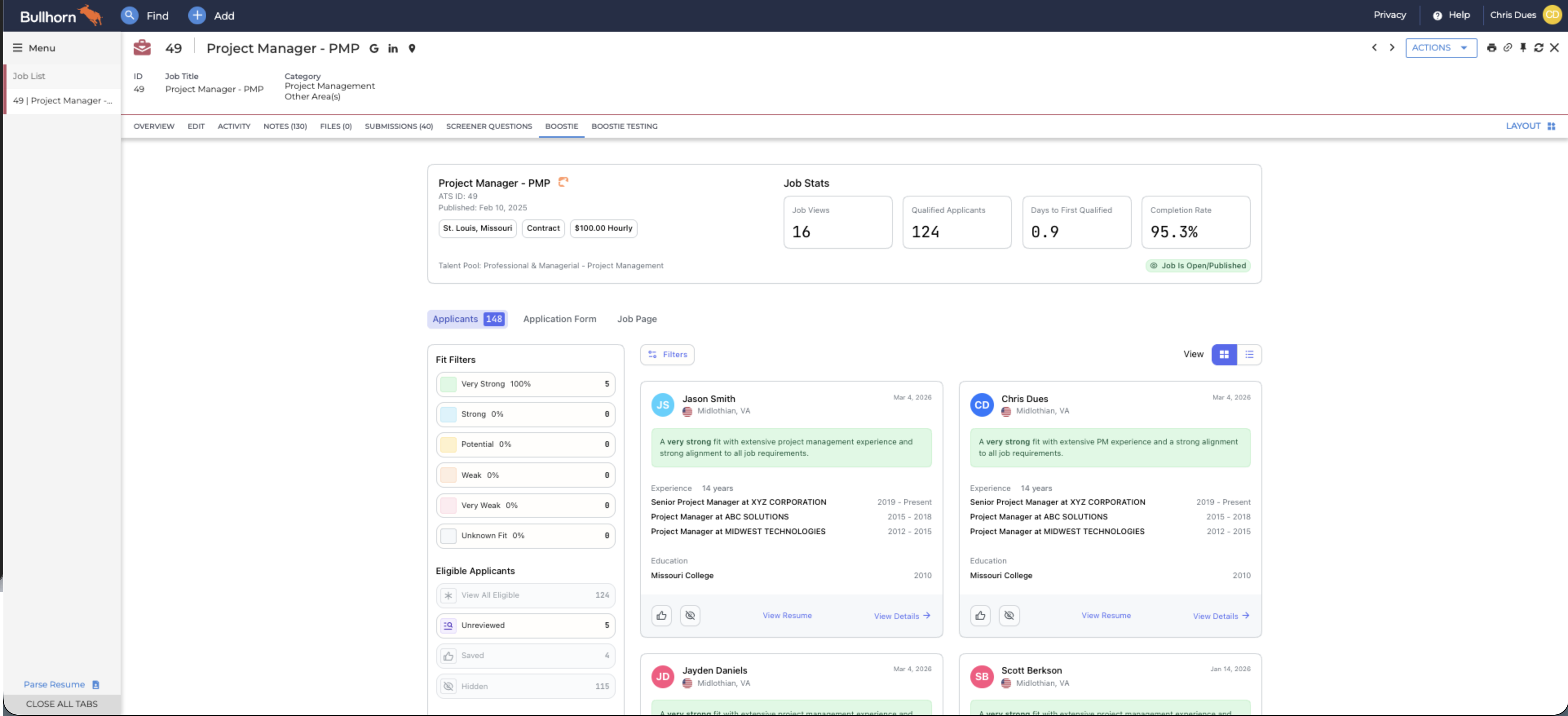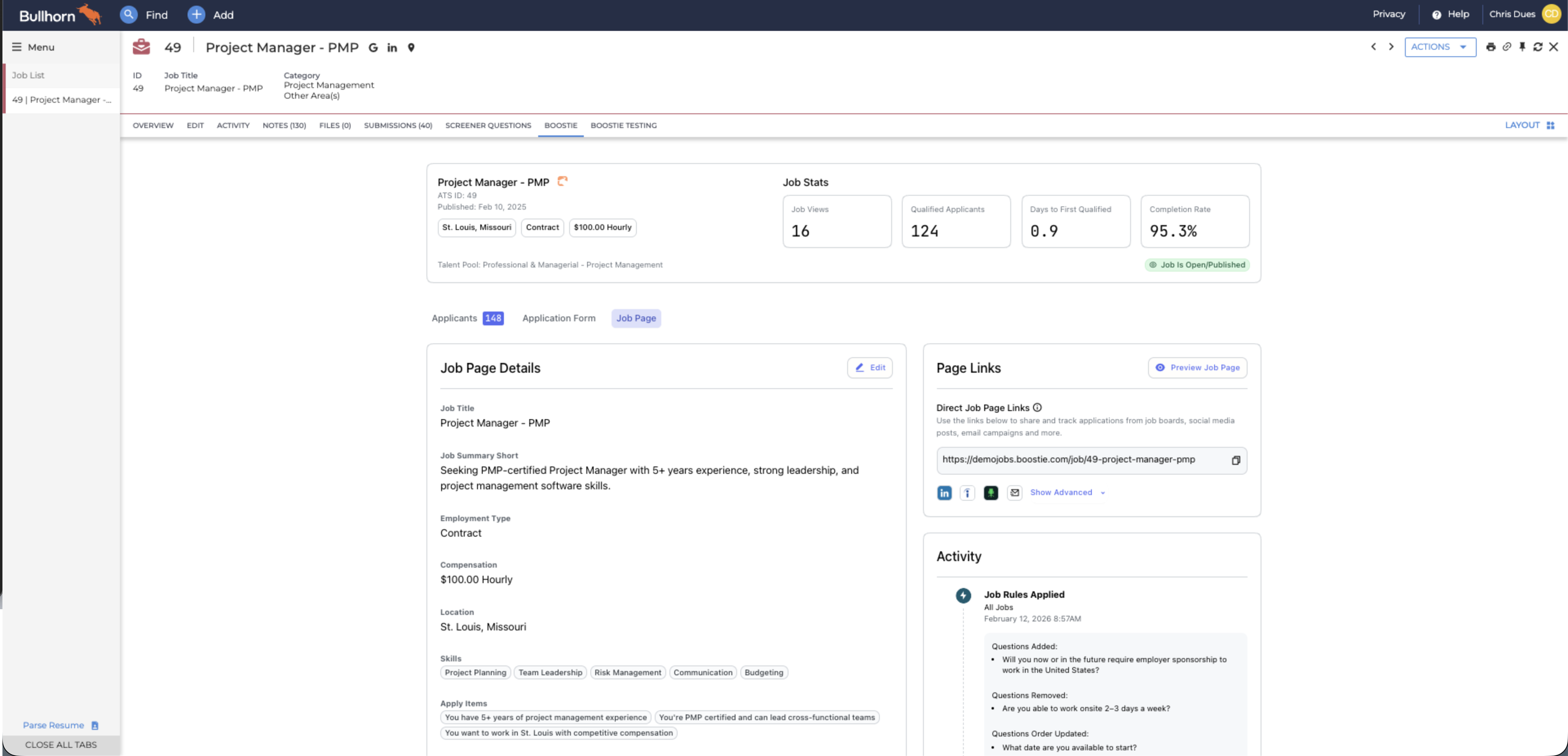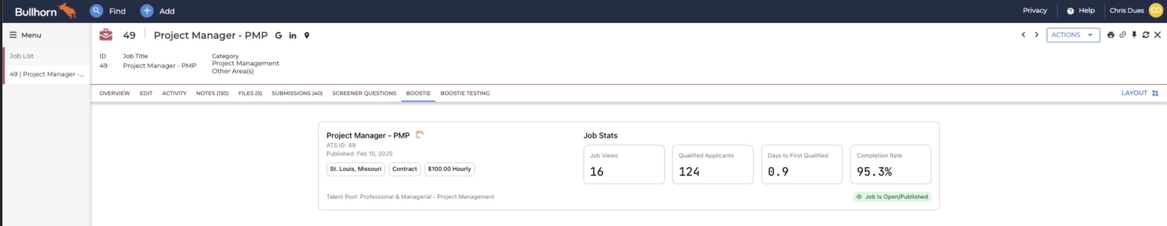Recruiter View lives inside Bullhorn ATS on the Boostie tab of a Job. It’s your command center for the job’s performance, applicants, and the candidate experience Boostie creates on the front end.
