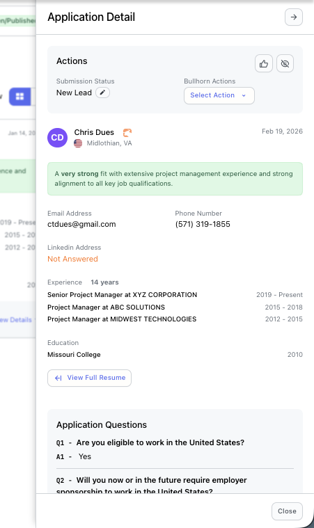 Recruiter View (Bullhorn ATS): Applicants, Application Form, Job Page