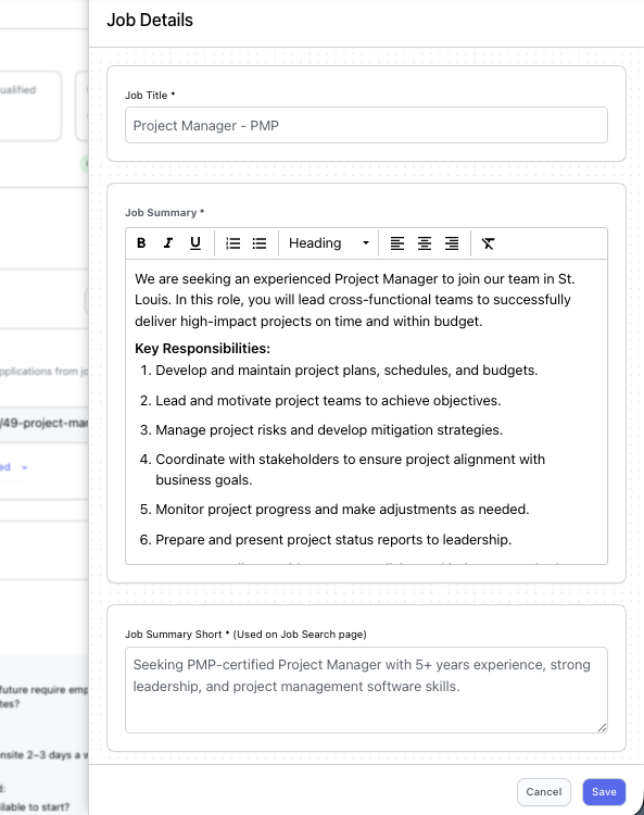- Typically reads from your internal job description field and writes back to Bullhorn’s Published Job Description field