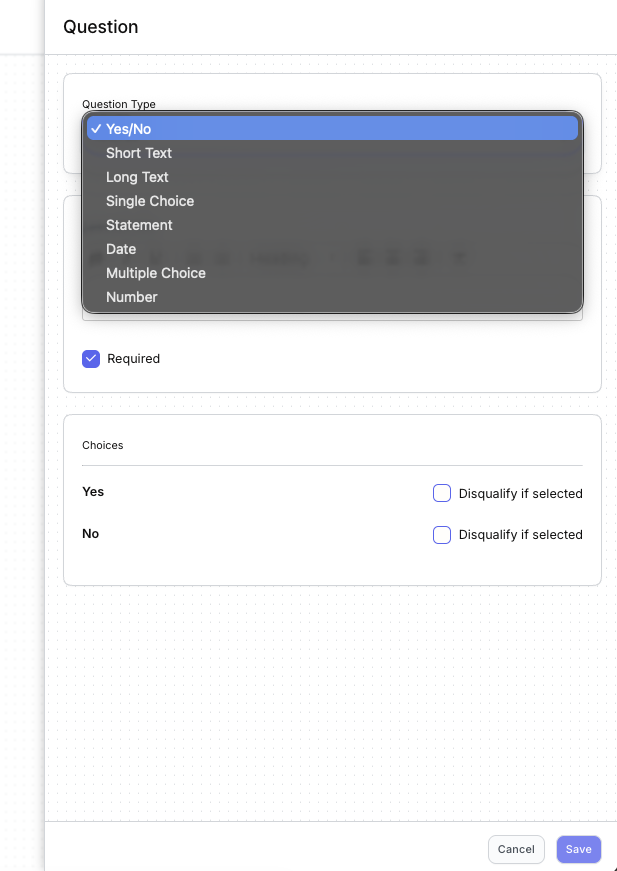 - Choose your Question Type. The slide-out fields adjust based on the type selected, Short Text questions just need a Required decision, while Multiple Choice questions require you to build out the answer options.