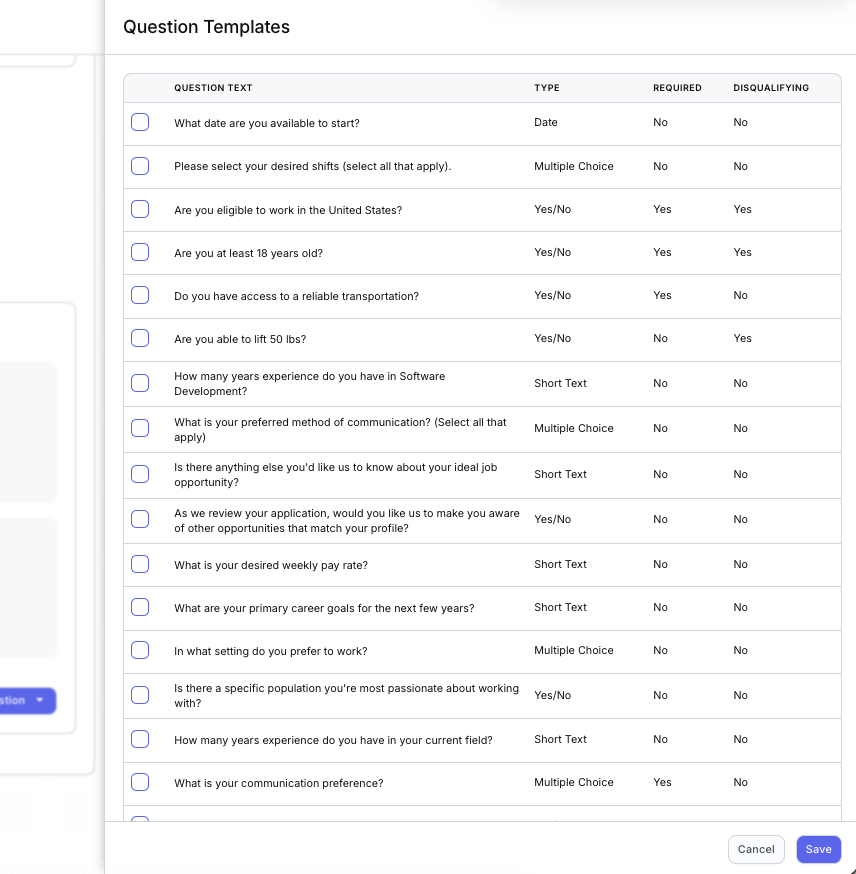 - Select the questions you want to add. Each question shows its type, whether it's Required, and whether it's Disqualifying. You'll be able to adjust the Required and Disqualifying settings after adding them to the Advanced Questions section. When finished, click Save in the bottom right.
