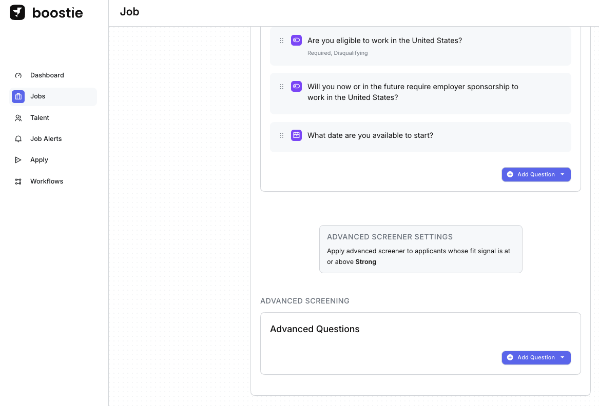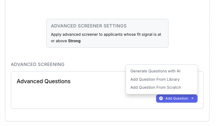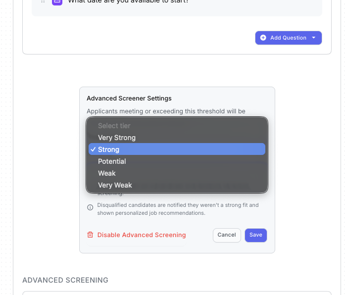 - Tip: If you click Disable Advanced Screening and save, don't worry, your questions aren't gone. Re-enable the Advanced Screener, choose your Fit Signal, and click Save. Your previously created questions will reappear.