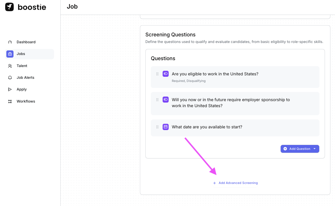 Scroll below the Screening Questions section. You'll see either a grey Advanced Screener Settings box or a + Add Advanced Screening link. Click either to enable it and begin configuration.