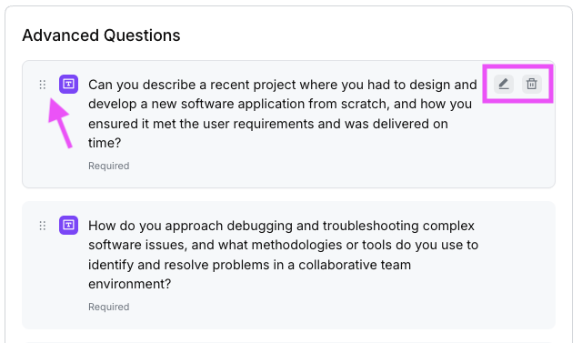- To edit a question, hover over it and click the pencil icon. To delete, click the trash can icon.