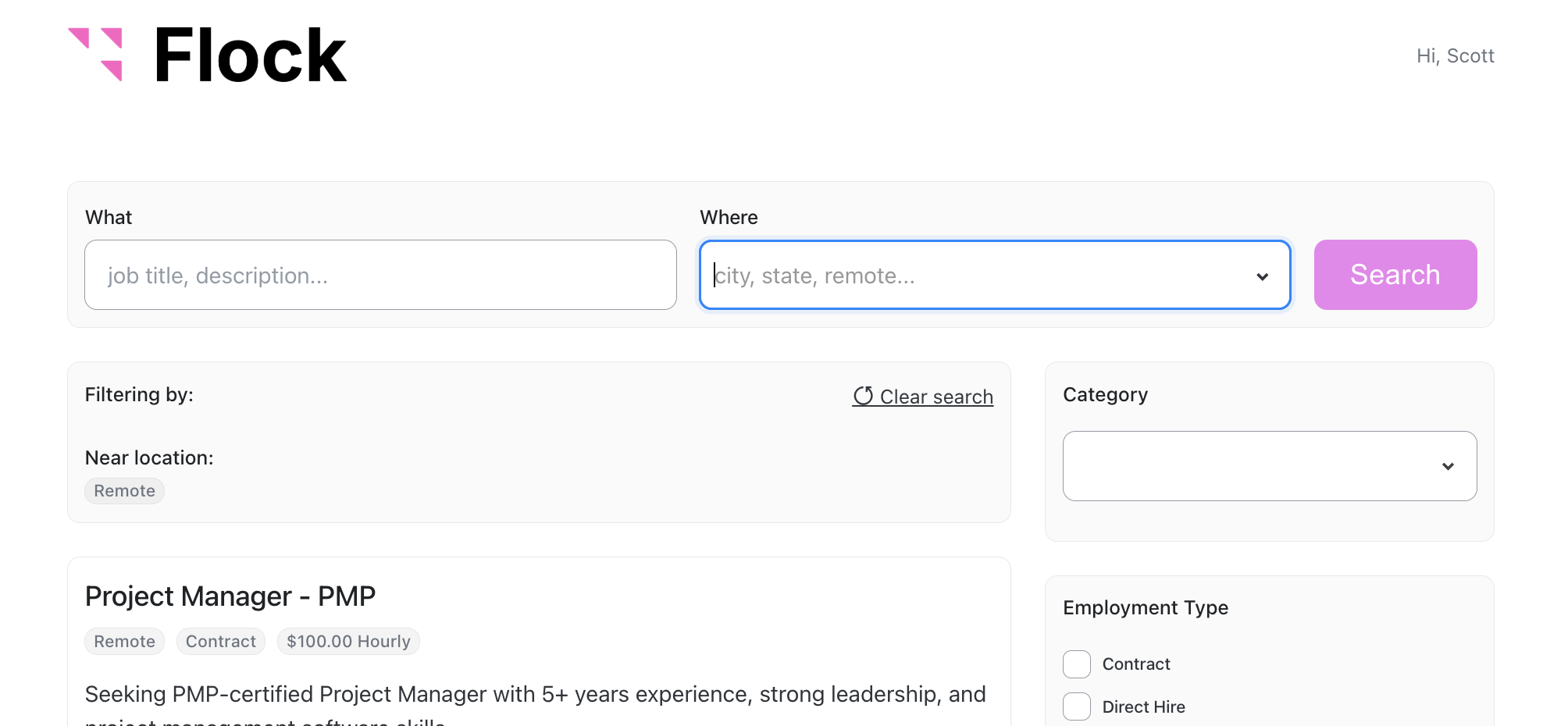 1. Head to the job board and find the "Where" field. Right next to the "What" search bar, you'll see a field with the placeholder city, state, remote... that's your starting point.