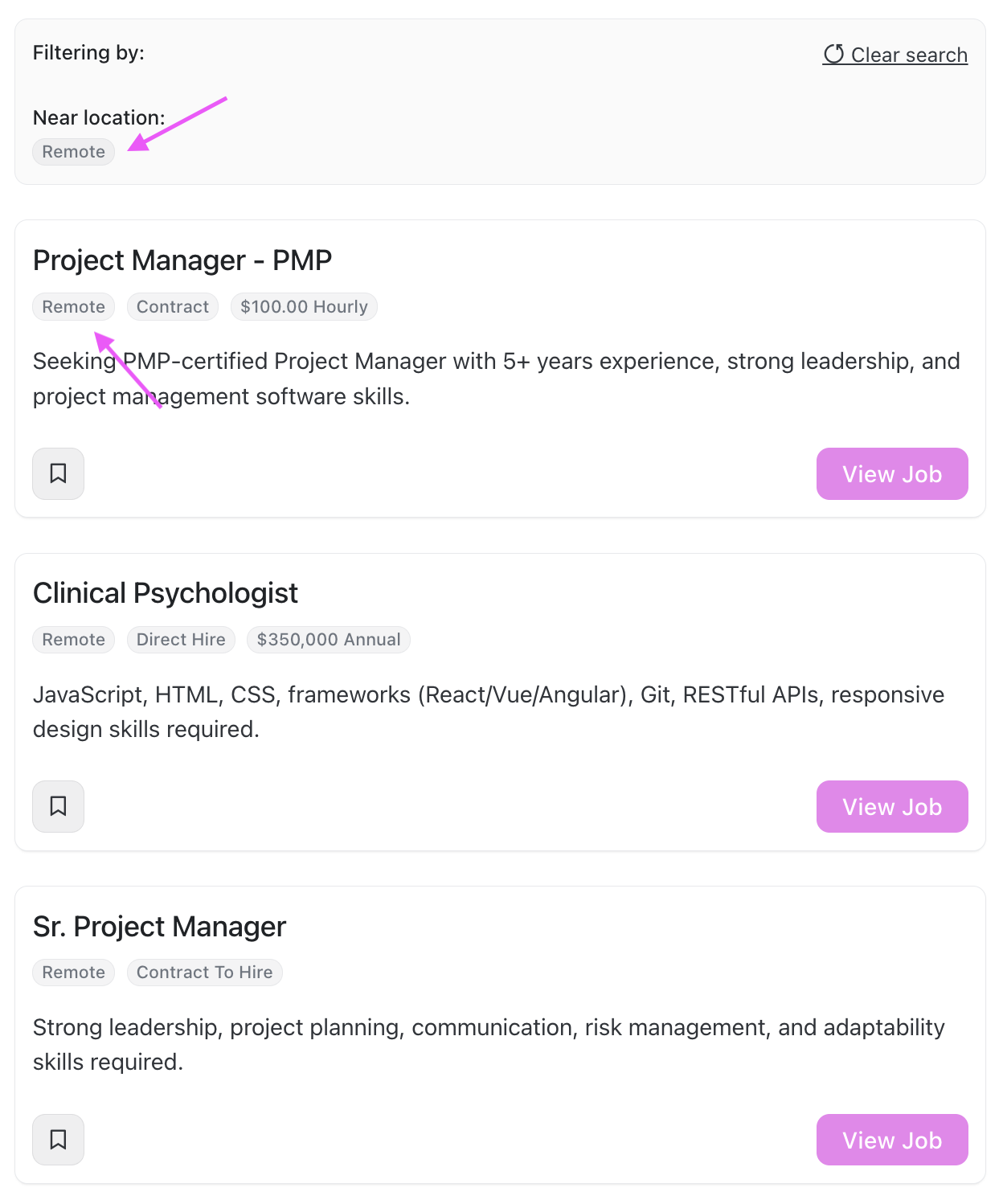 3. Hit Search. Results load instantly. A "Filtering by" banner confirms the active filter — in this case, Near location: Remote.