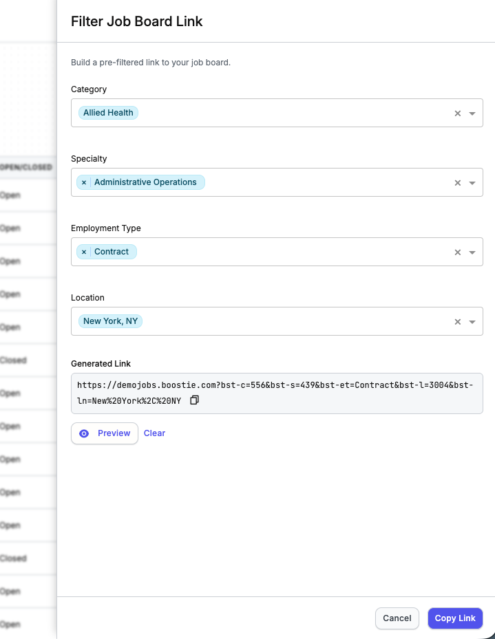 - In the Filter Job Board Link slideout, select your filters - Category, Specialty, Employment Type, and Location.