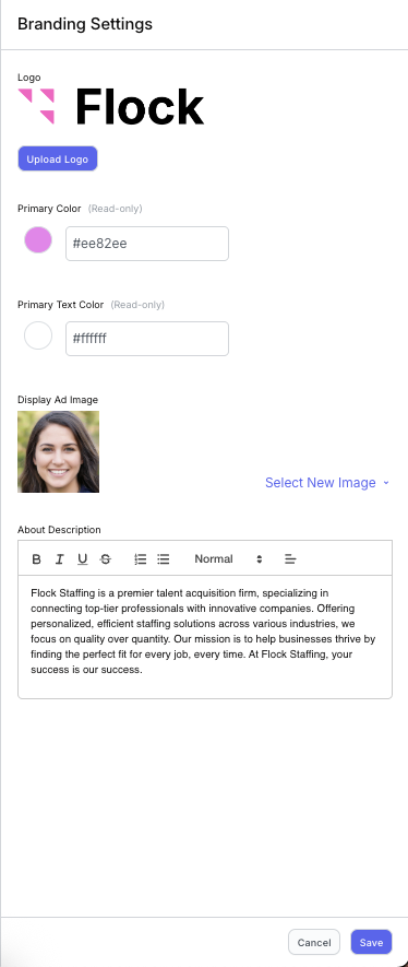 - Upload your company logo and display ad image, and enter your external company description.