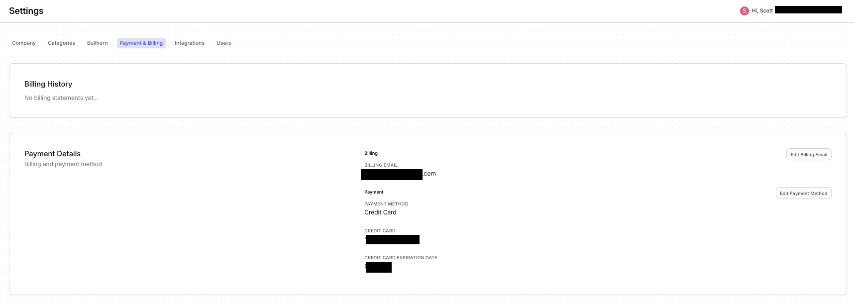 The Payment & Billing section is where you can manage your company’s billing email and payment method used for your Boostie subscription.