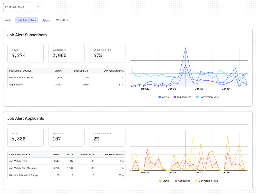The Job Alerts Stats section of the dashboard shows how effectively you’re converting visitors into subscribers and applicants.