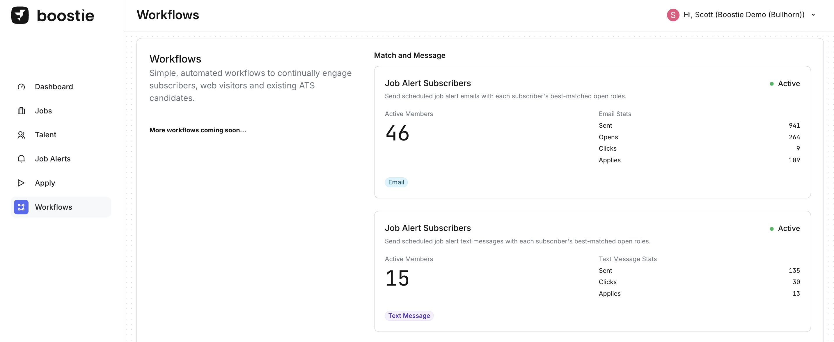 Boostie Workflows are simple, automated plays that keep candidates engaged, whether they’re job alert subscribers, website visitors, or existing ATS talent, without your team lifting a finger.
