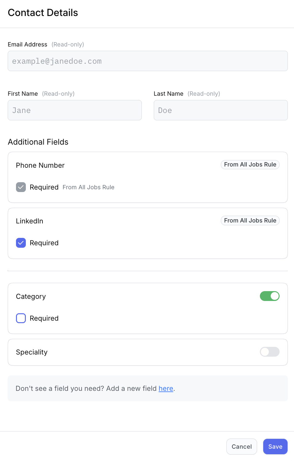 Click Add a new field here to jump to Apply → Questions + Fields to enable or configure additional fields