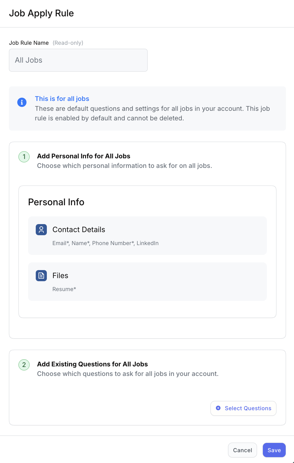 When your criteria, personal info fields, and questions are complete, click Save on the Job Apply Rule slide-out.