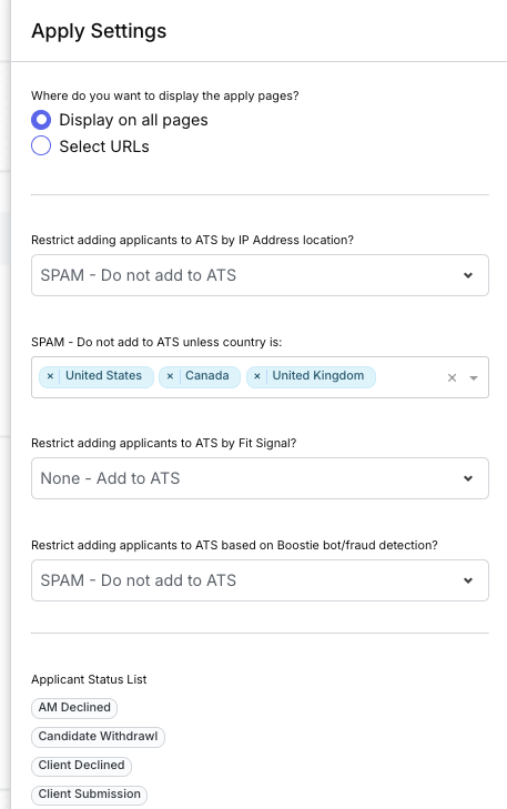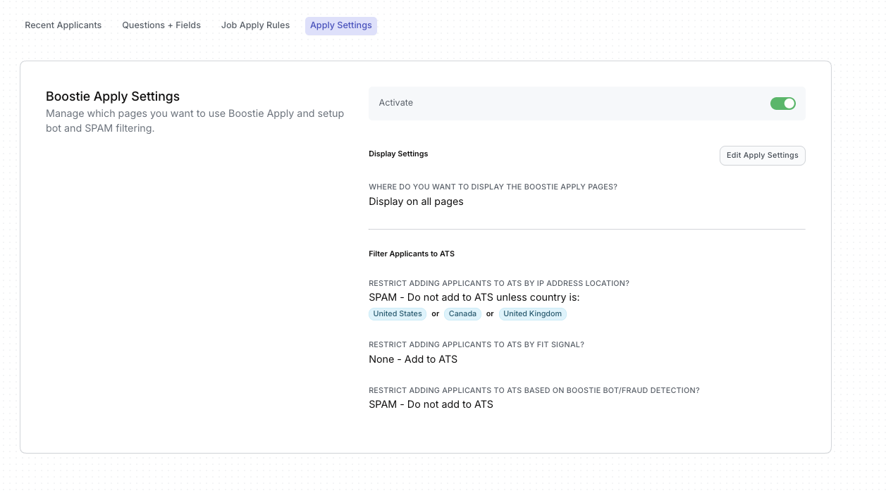 Boostie Apply Settings give you precise control over where Boostie Apply appears and which applicants make it into your ATS. This is where you activate Apply, fine tune visibility across your site, and protect your pipeline from bots, spam, and low-quality traffic.