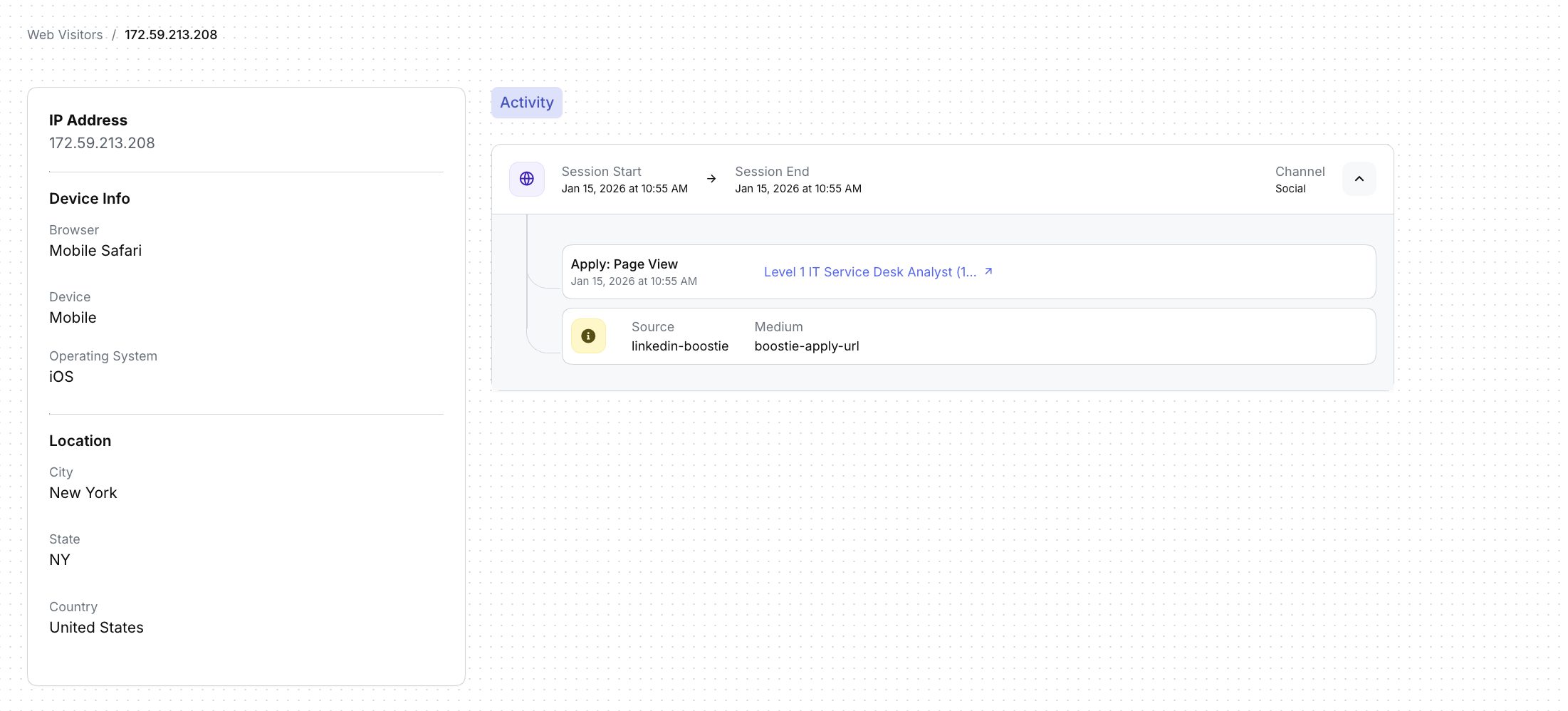 This is Boostie’s view into anonymous traffic. You’ll see how external sources like email campaigns, social posts, and direct traffic are driving visits to your site, and how those visits eventually convert into known candidates.